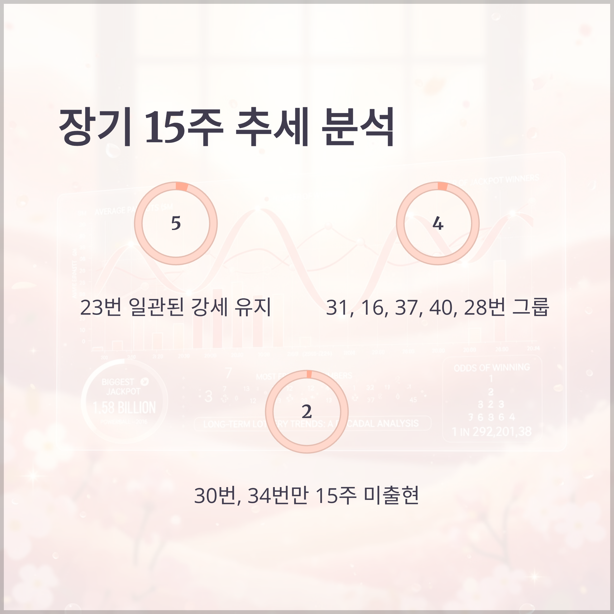 15주간 장기 추세를 살펴보면 23번이 5회로 여전히 최다 출현을 유지하고 있습니다. 이는 단기 3주부터 중기 10주, 장기 15주 모든 구간에서 일관되게 높은 출현빈도를 보여줍니다.