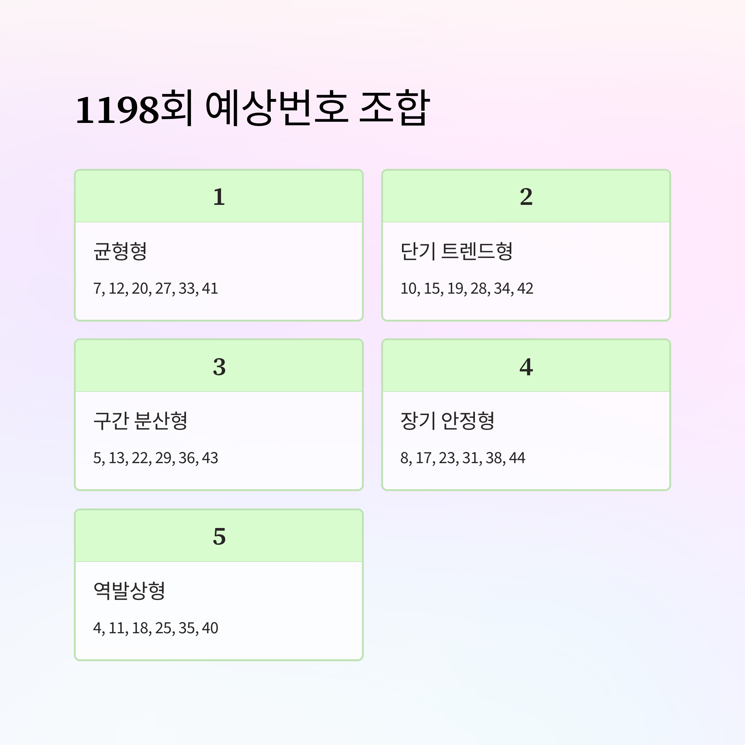 위의 모든 분석을 종합하여 1198회 예상번호 조합을 제시합니다.