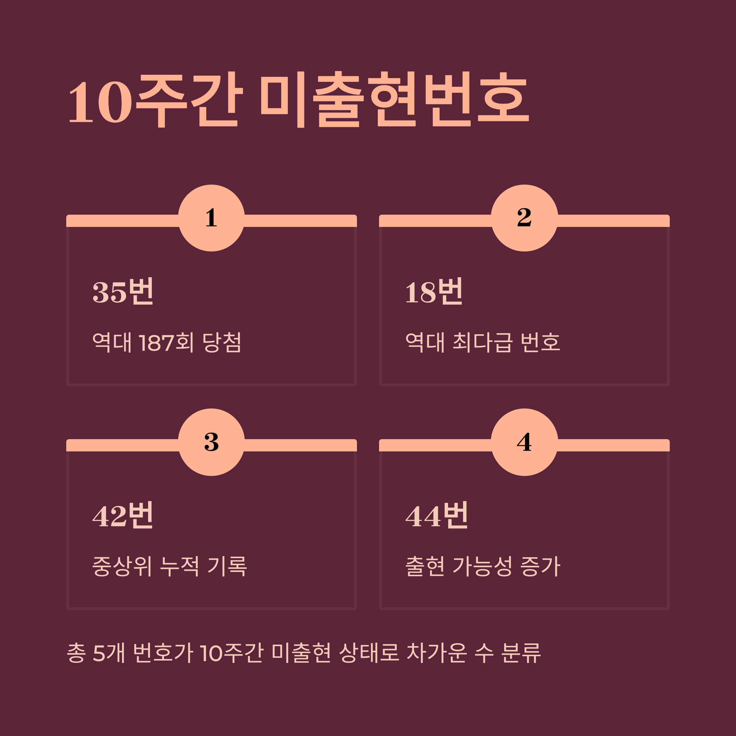 미출현번호를 분석할 때는 역대 누적 당첨횟수도 함께 확인하는 것이 중요합니다. 35번은 역대 187회, 22번은 160회, 42번은 176회, 18번은 190회, 44번은 182회 당첨된 기록을 보유하고 있습니다. 특히 18번은 역대 190회나 당첨되었음에도 최근 10주간 나오지 않았다는 점에서 주목할 만합니다.